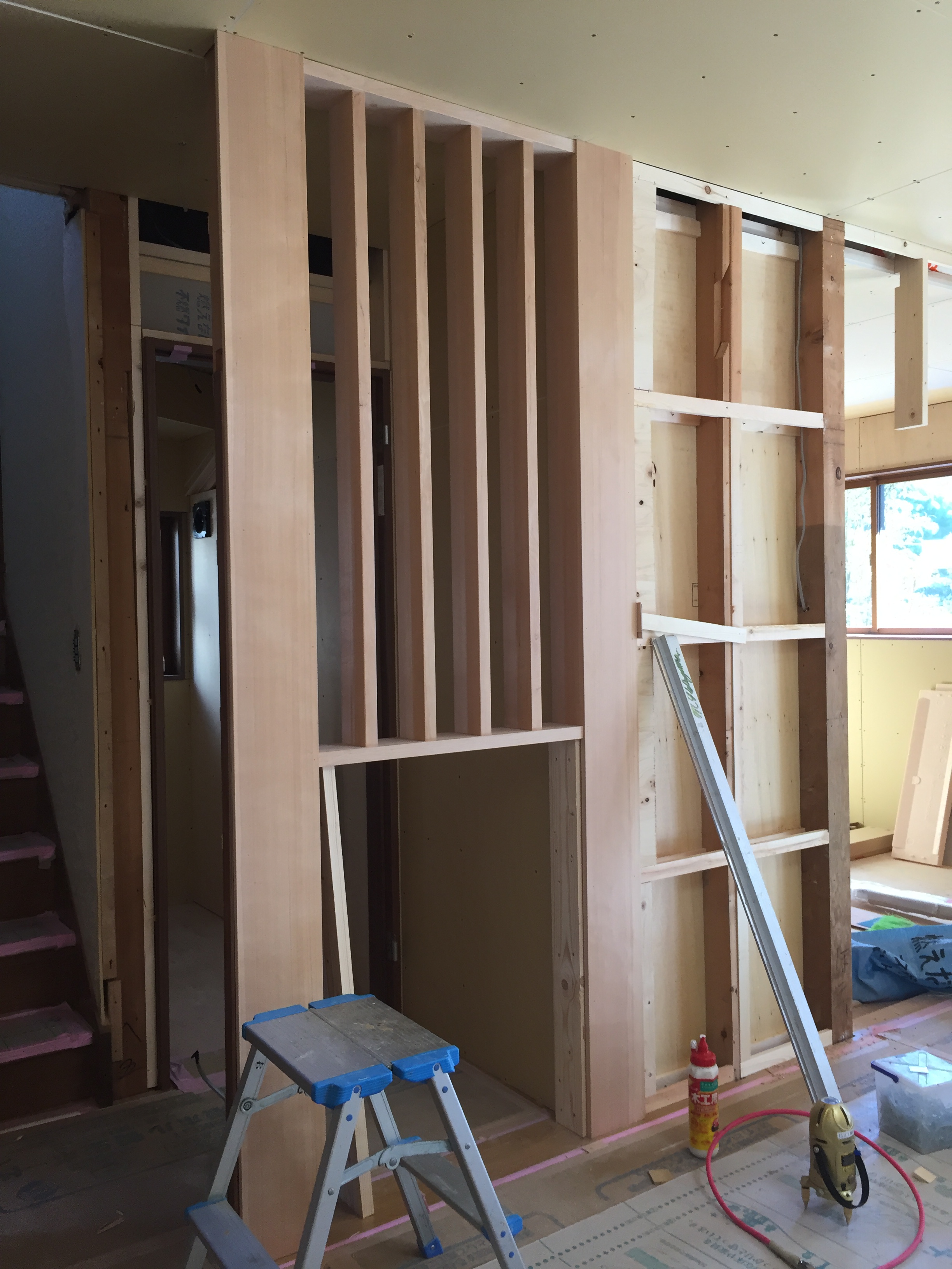 大規模改装工事進捗状況!只今造作工事中です!LDK・階段周りの飾り格子の組立中 です!