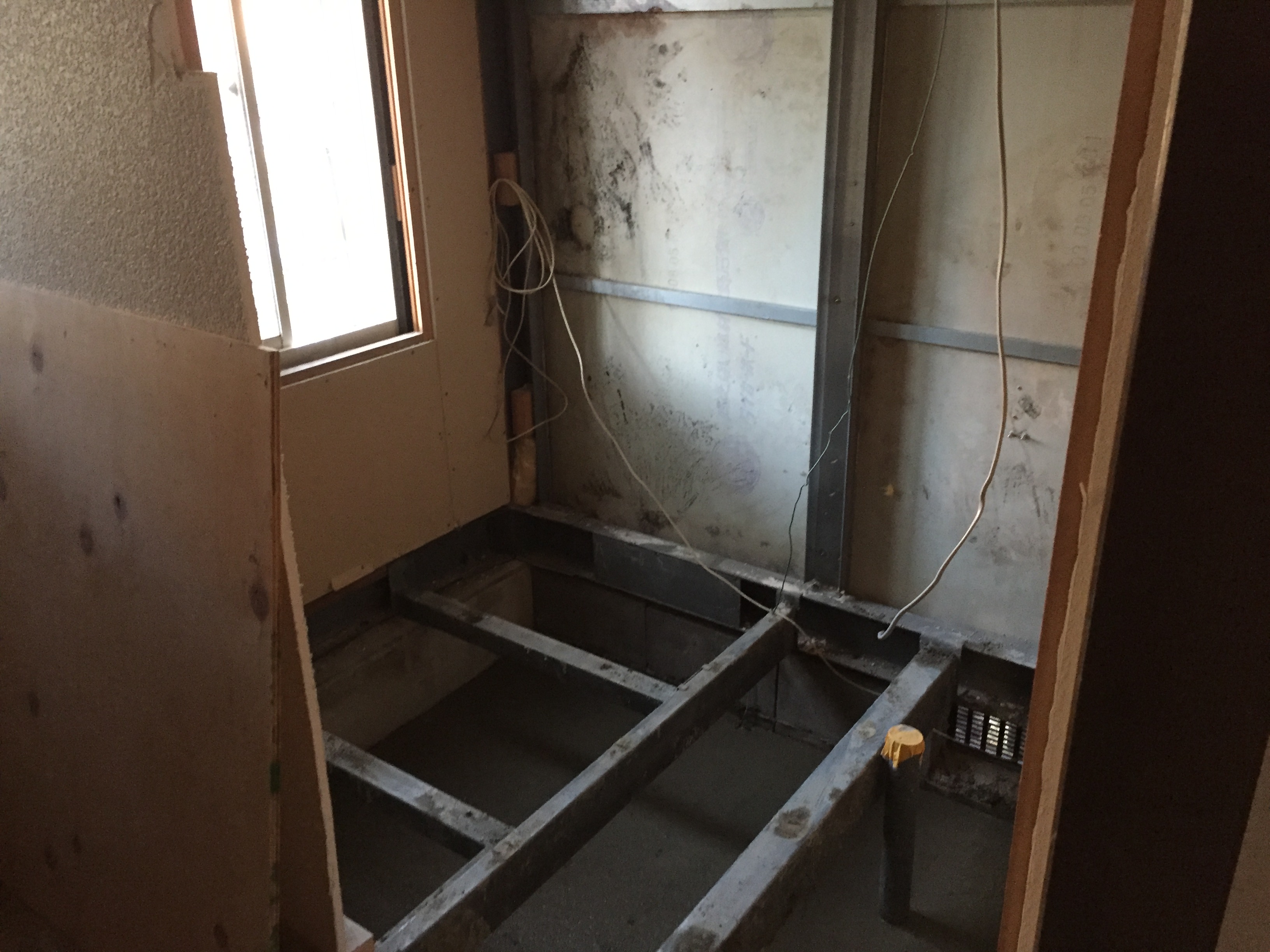 浴室改装工事進捗状況!既存ユニットバスの解体が完了しました。軽量鉄骨造で既存 浴室に鉄骨の土台がありますでこれから撤去・補強工事を行います!