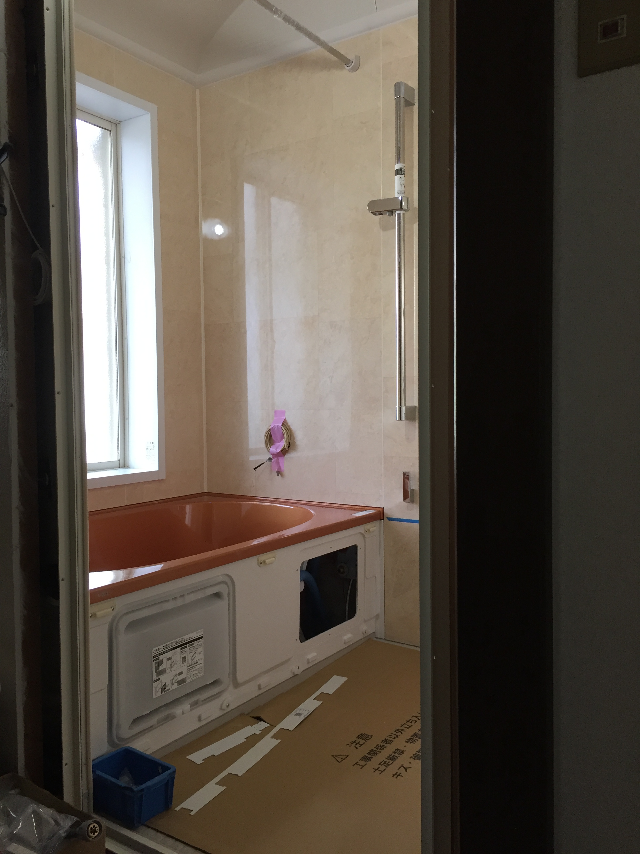 浴室改装工事進捗状況!ユニットバス組立中です!ゴールドオレンジの浴槽がかっこ いいです!完成が楽しみです!