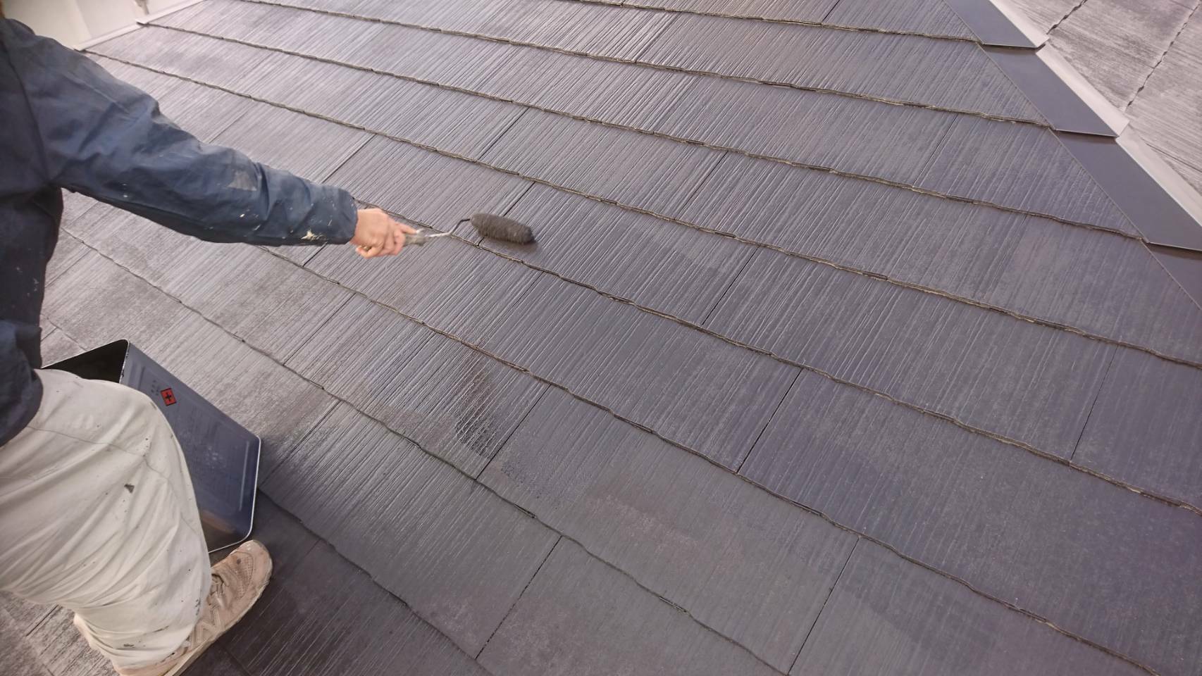 外壁・屋根塗装工事中です。屋根の下塗りですが、すでに輝きを取り戻しつつあります。完成が楽しみです‼