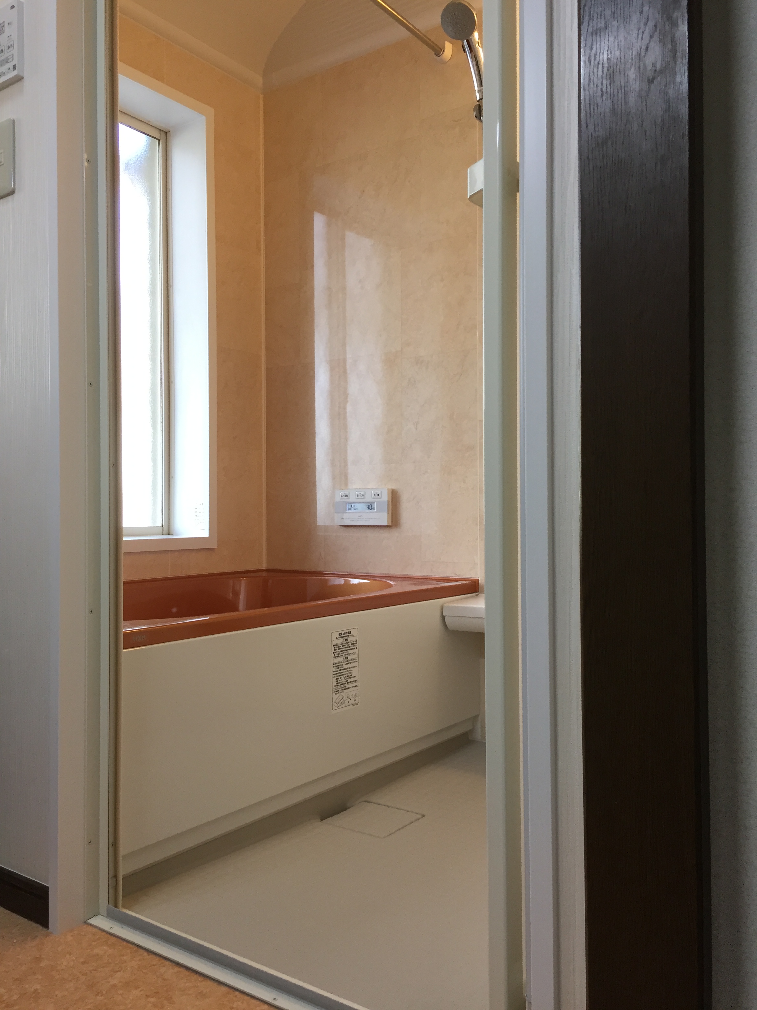 浴室改装工事完了!洗面室の内装工事も完了しました。オレンジを基調とした洗面 室・浴室の壁面とゴールドオレンジの浴槽とのコンビネーションがお洒落です!お待 たせしました本日から使用して頂けます!