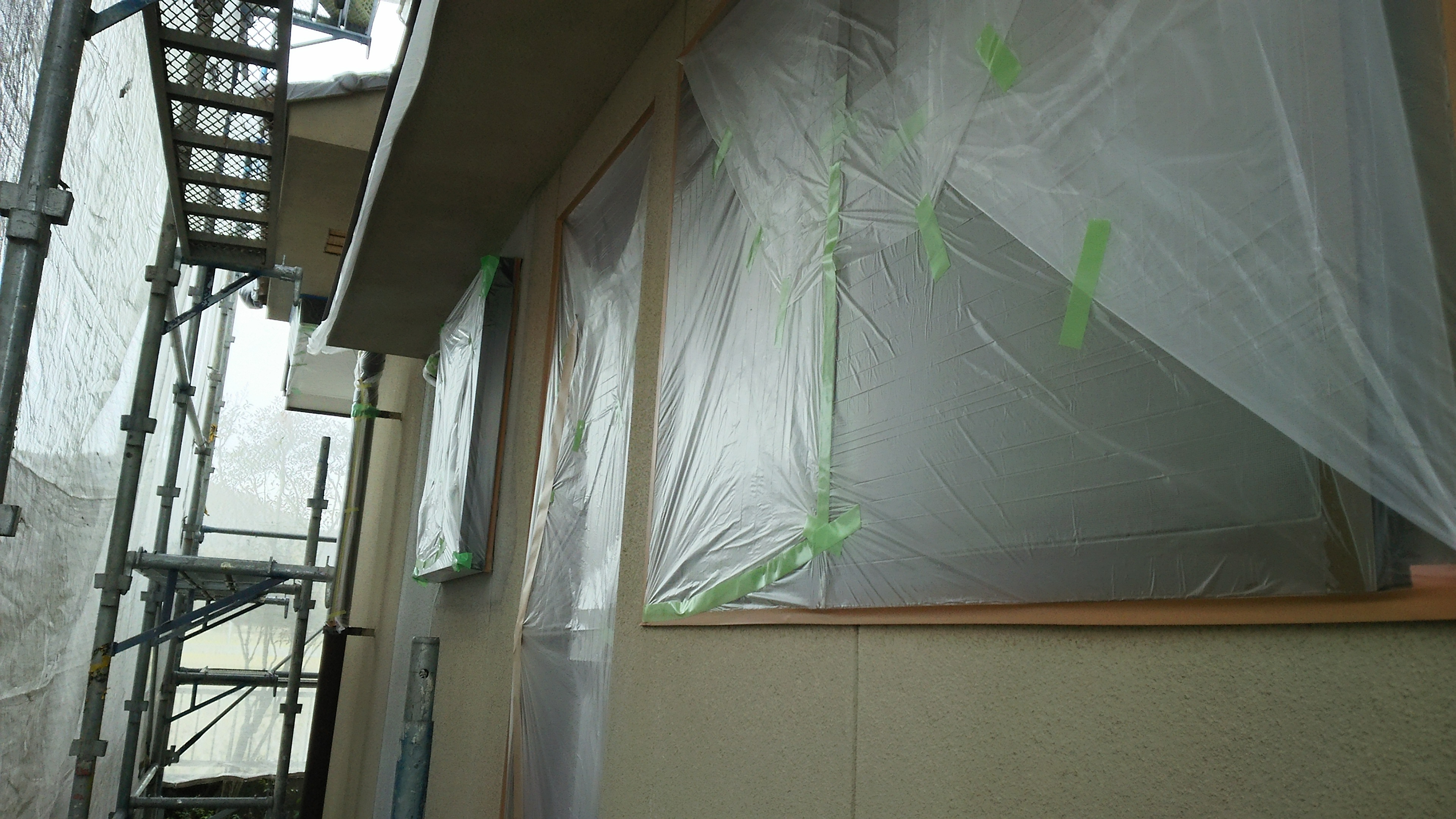 外壁養生中です。綺麗に養生するかどうかで仕上りに大きく差が出ます‼