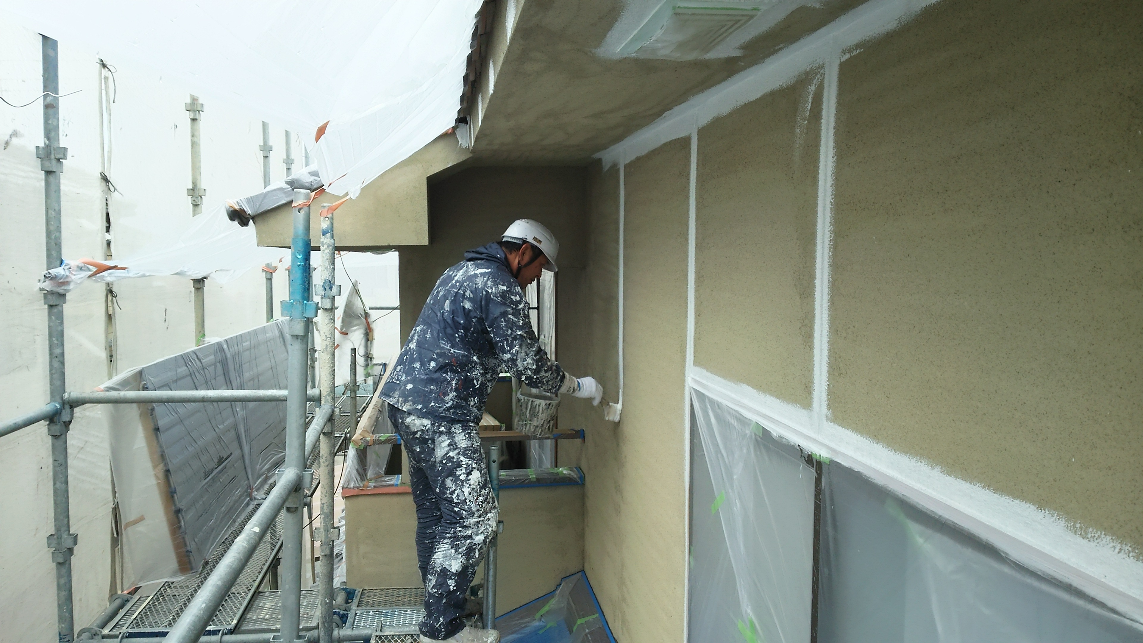 外壁工事中です。シーラー塗布した後に下塗りの工程ですが、まずは壁際・目地から塗っていきます。