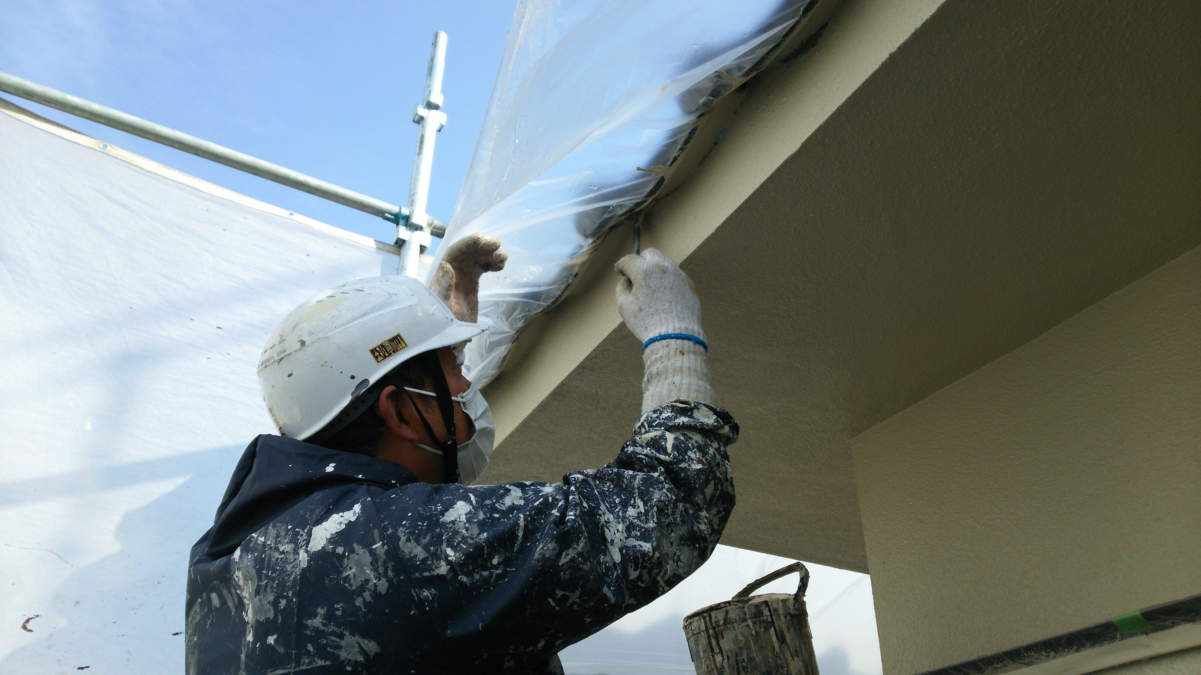 外壁塗装工事中です。中塗り施工中ですが、ローラーが入らない所は刷毛で細かく塗装していきます‼