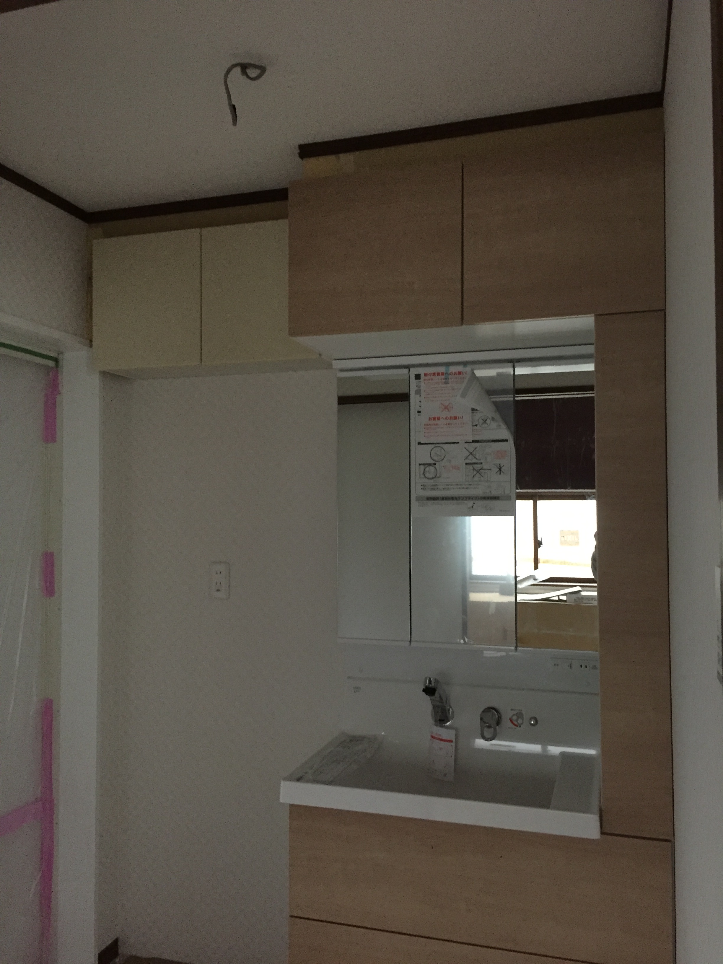 大規模改装工事進捗状況!洗面室のクロス張りも完了しまして只今洗面化粧台を設置 してます。向って左側の収納吊戸棚は今までお施主様が使われてました物を取付けて ます!