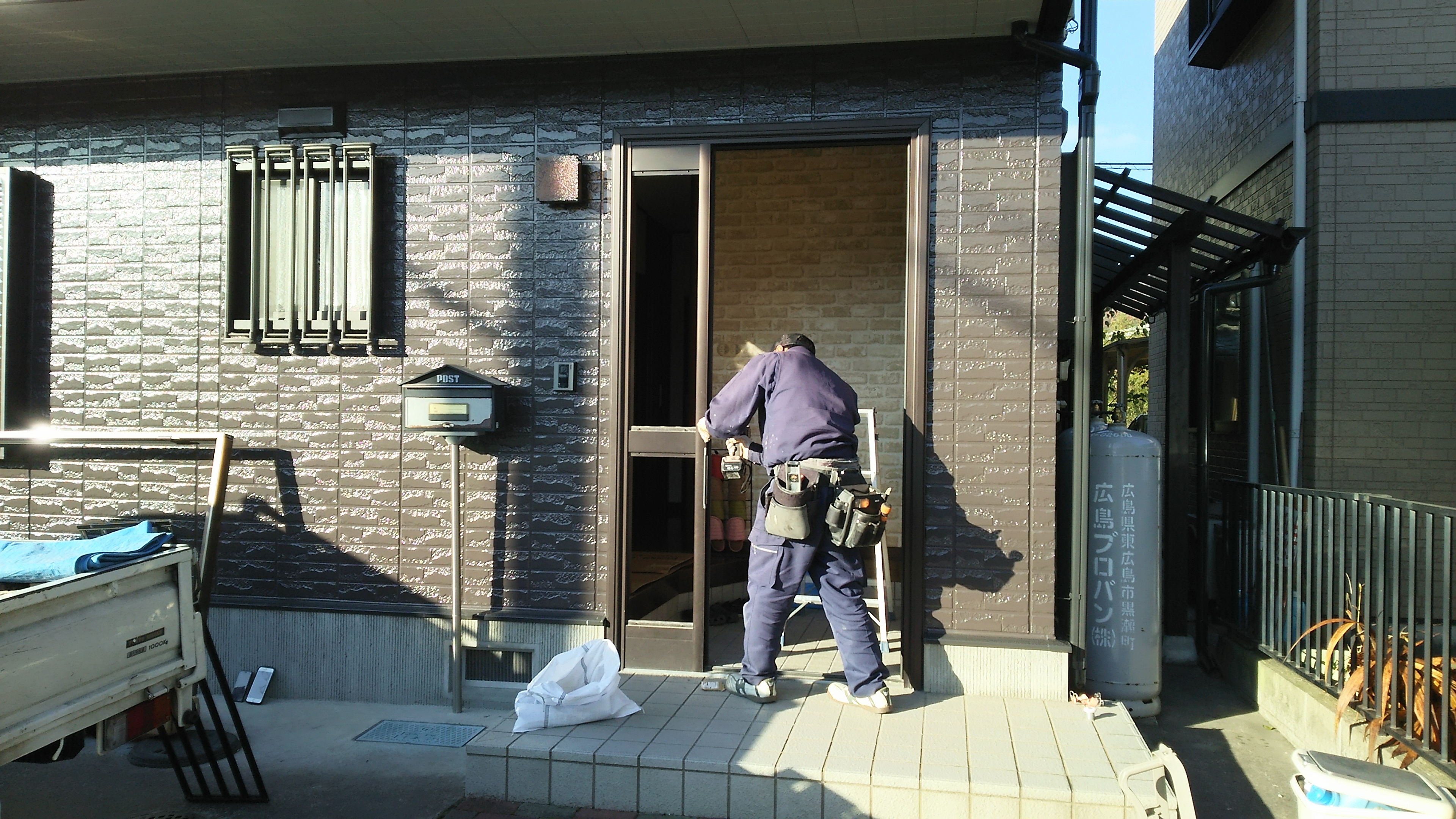 玄関ドアリフォーム工事中です。和室や浴室など内部の工事から始まり、外壁・屋根塗装工事も終わり2ヵ月近くにわたる工事もいよいよ大詰めです‼