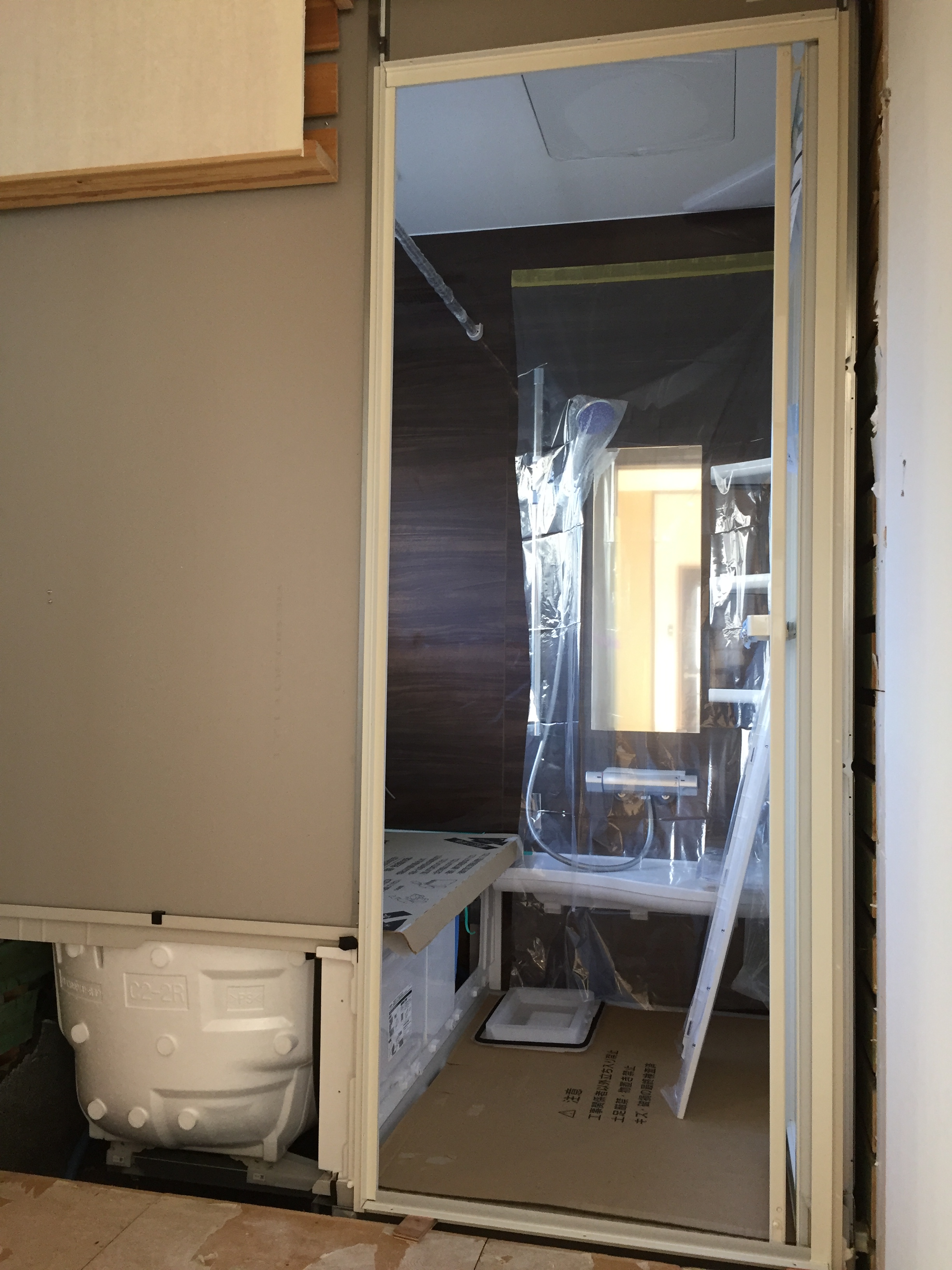 浴室・洗面室改装工事進捗状況!ユニットバスの組立が完了しました。養生が取れる のが楽しみです!