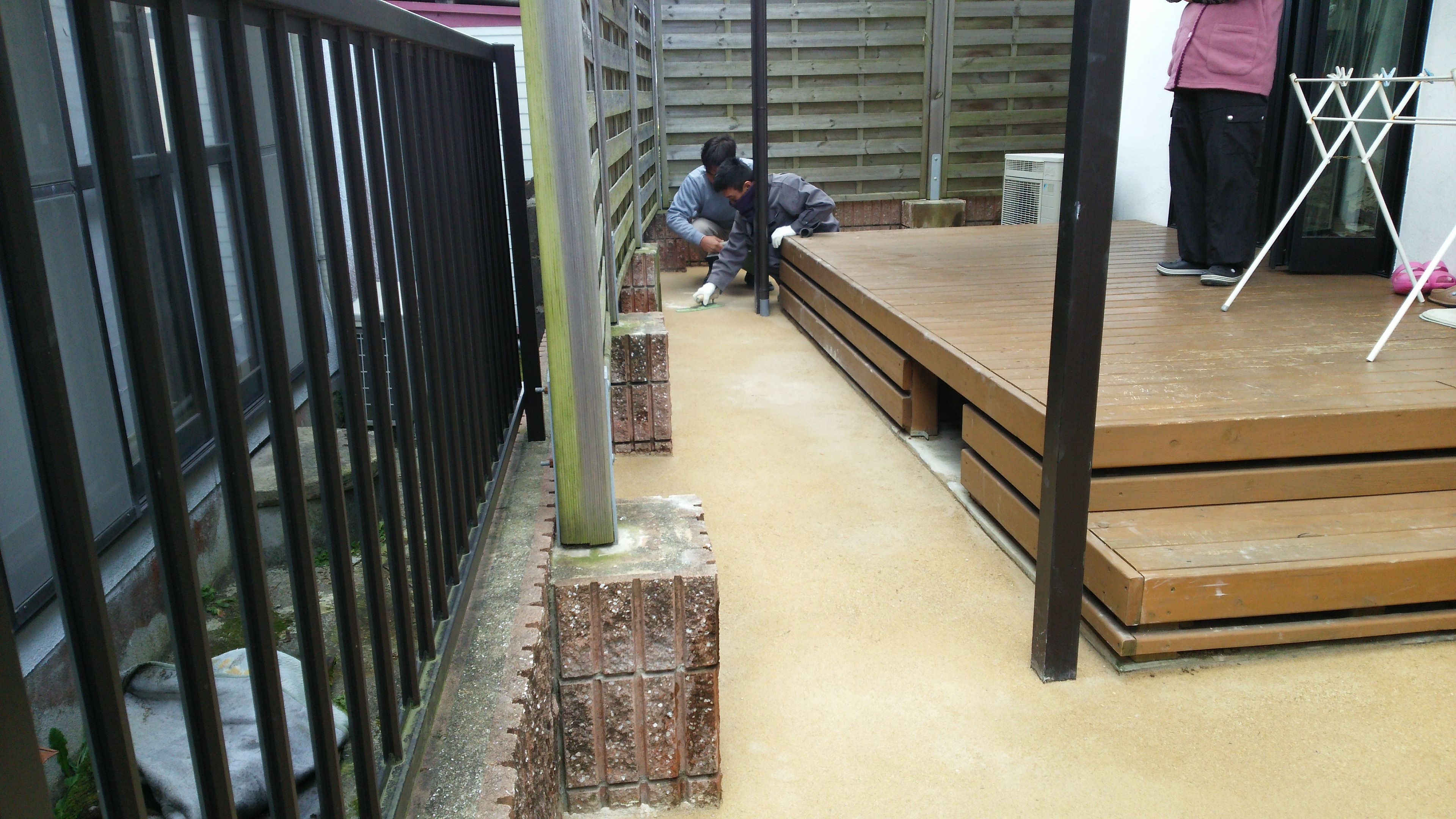 エクステリア工事進行中。雑草アタックを施工中です。最後の仕上げ作業をおこなっています。