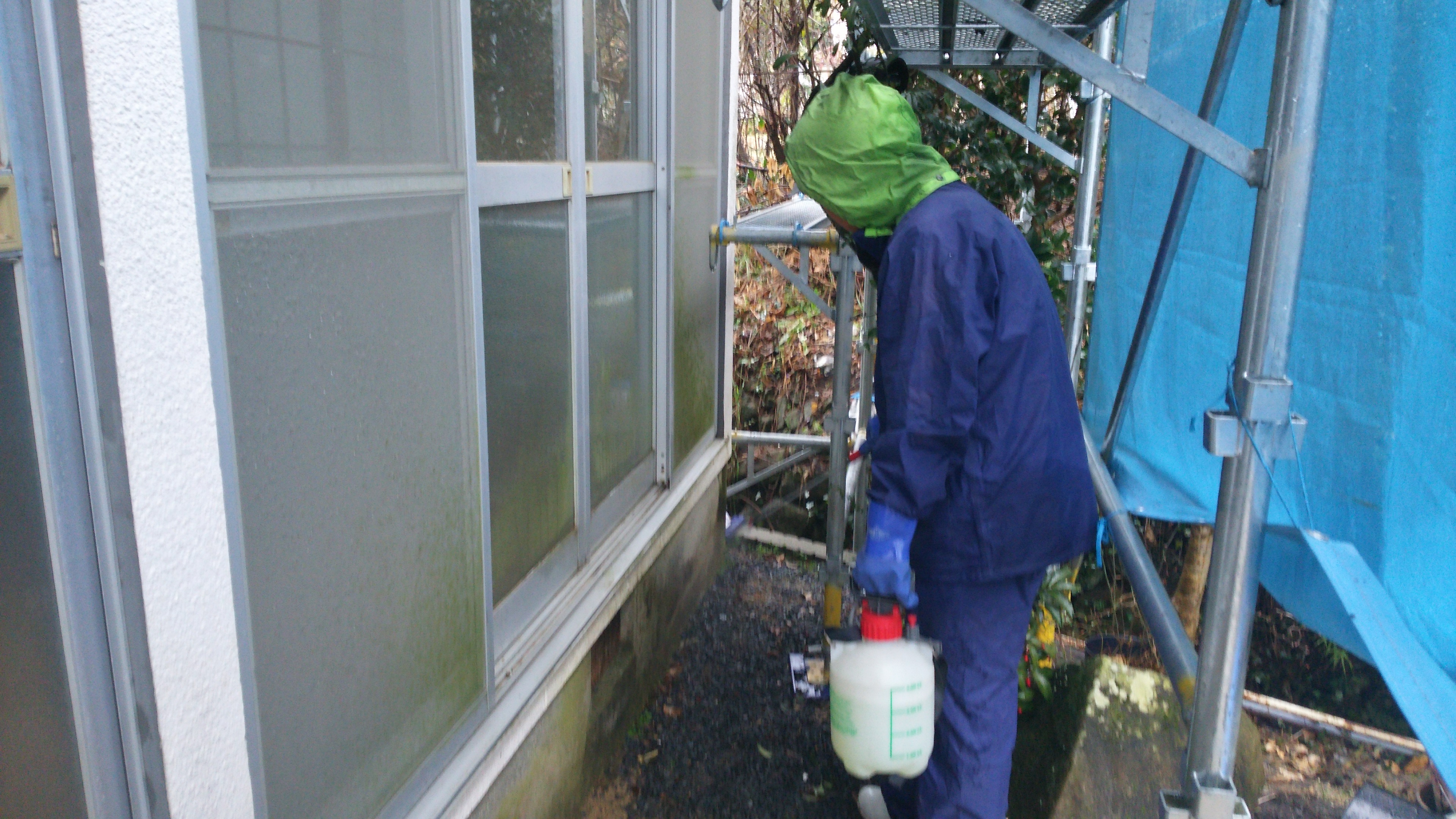中規模改装工事進捗状況。今日は外壁の洗浄です。オリバークリーナーを全体に吹きかけた後、高圧洗浄していきます‼