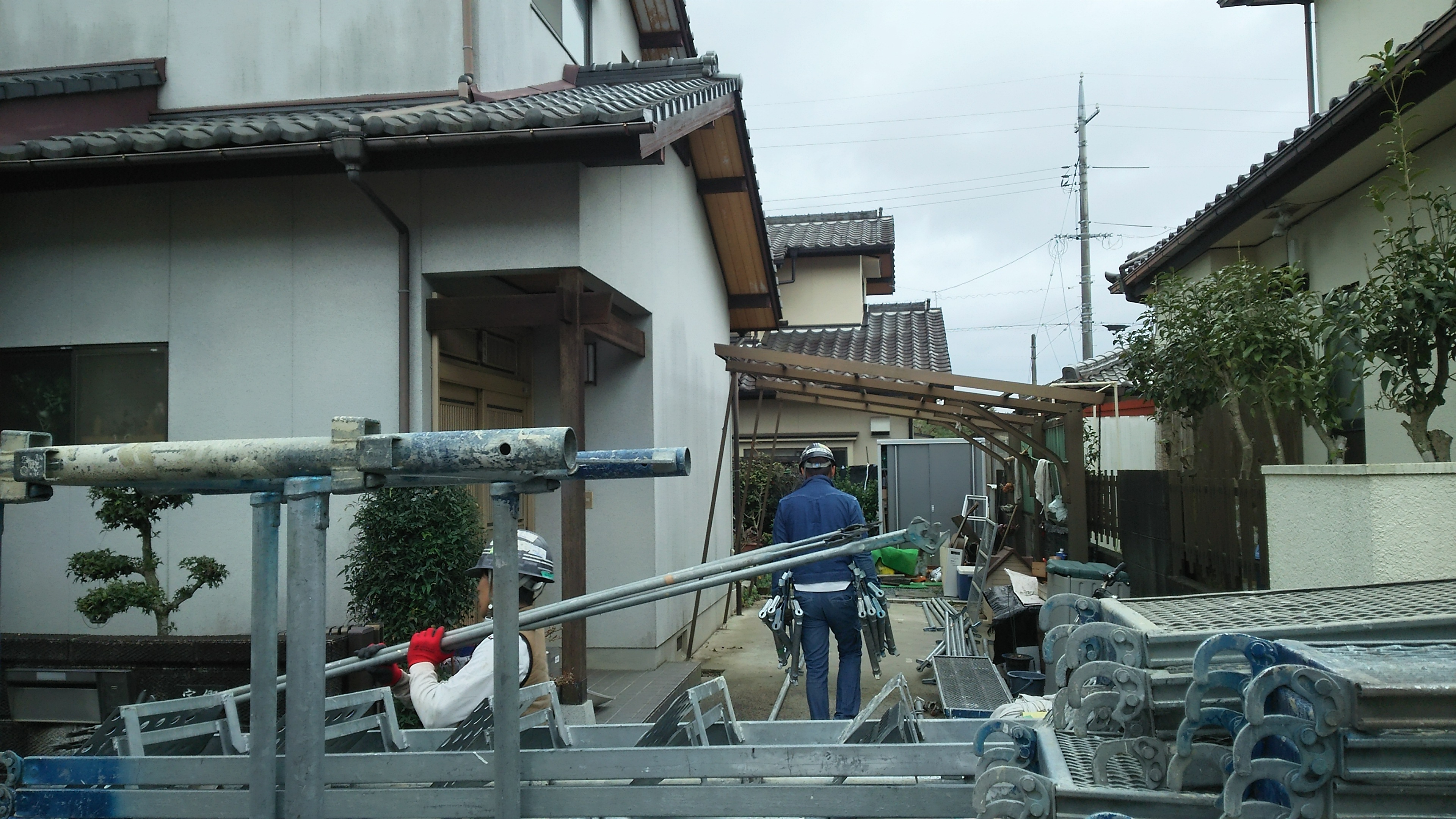 外壁塗装工事進捗状況。今日は足場を組み立てていきます‼