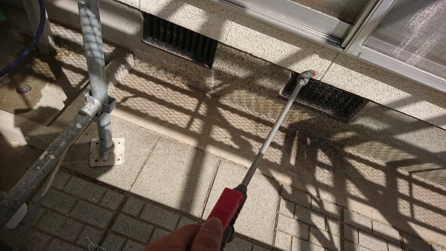 外壁塗装工事進捗状況。今日は外壁の洗浄です。洗浄前にオリバークリーナーを散布します。汚れの落ちが格段に変わります‼