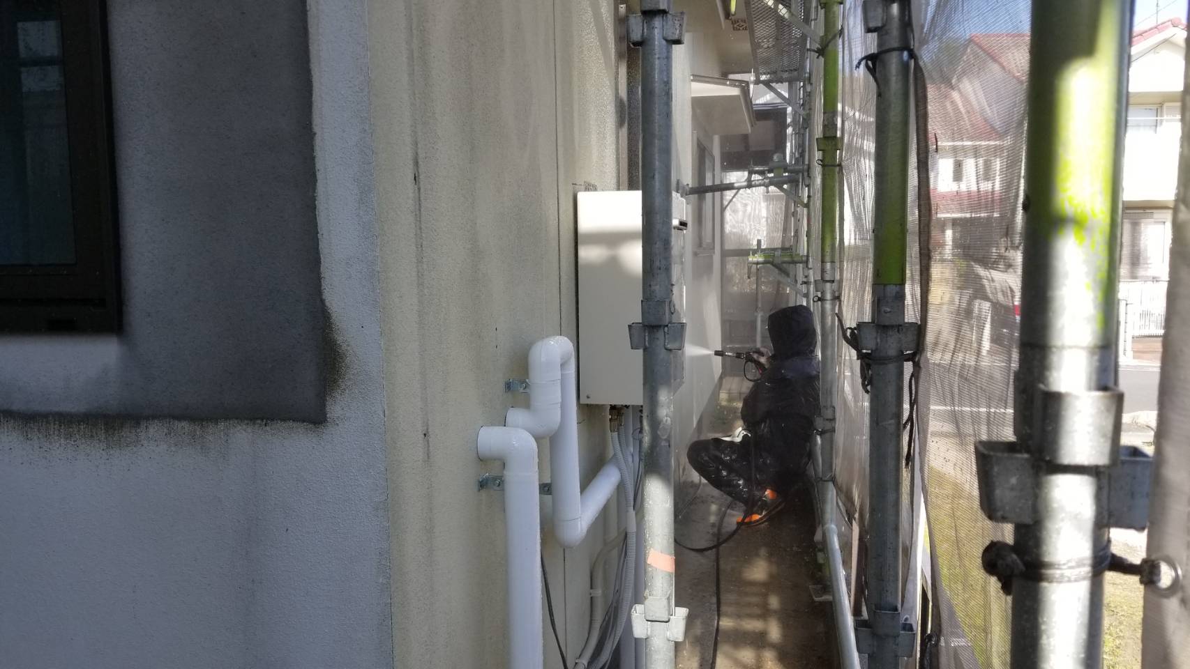 外壁塗装工事の外壁洗浄中です。専用の洗浄材をかけてから洗浄していきます‼