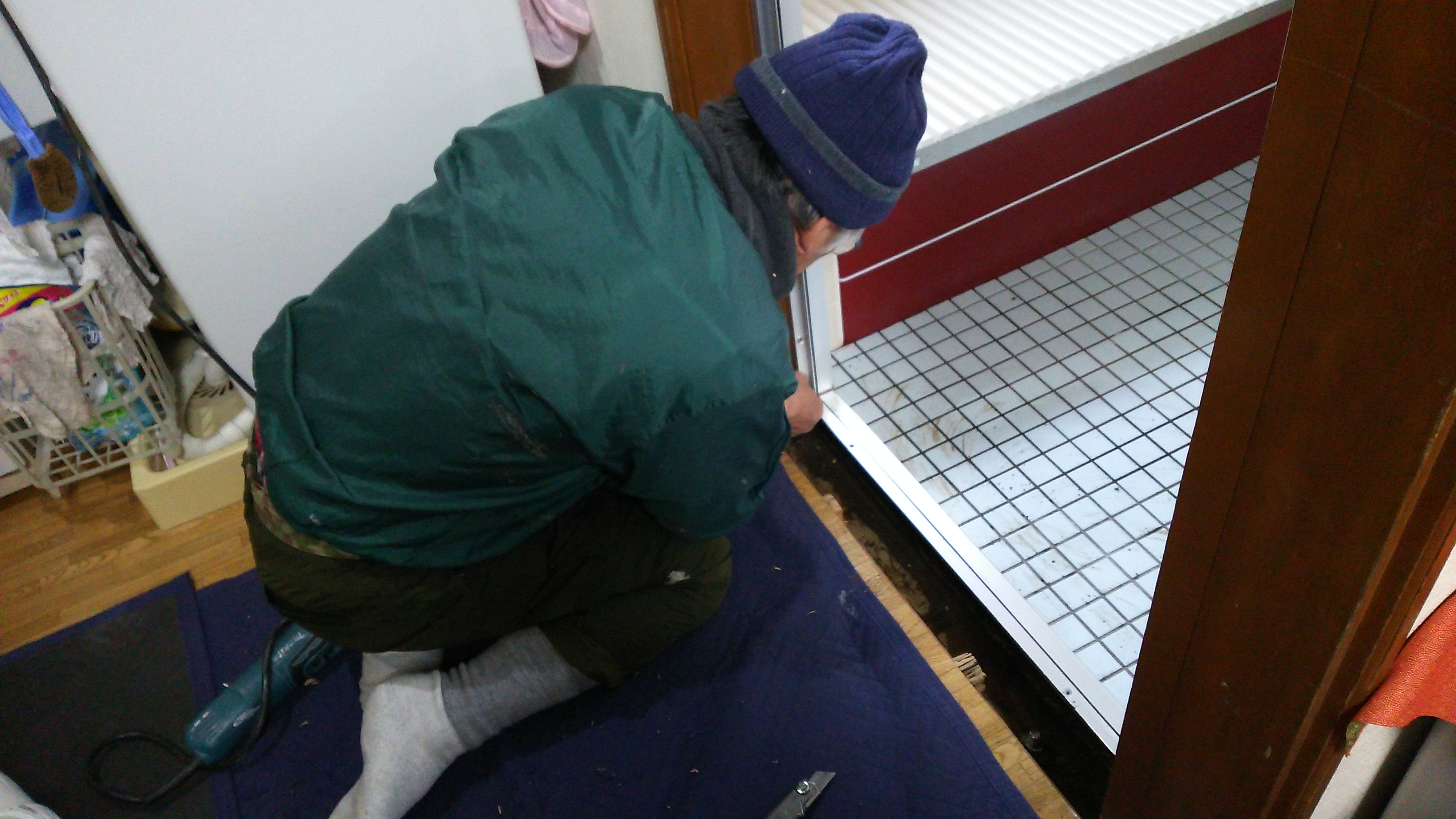 洗面所補修工事中です‼白蟻に食べられた敷居を取りかえています。