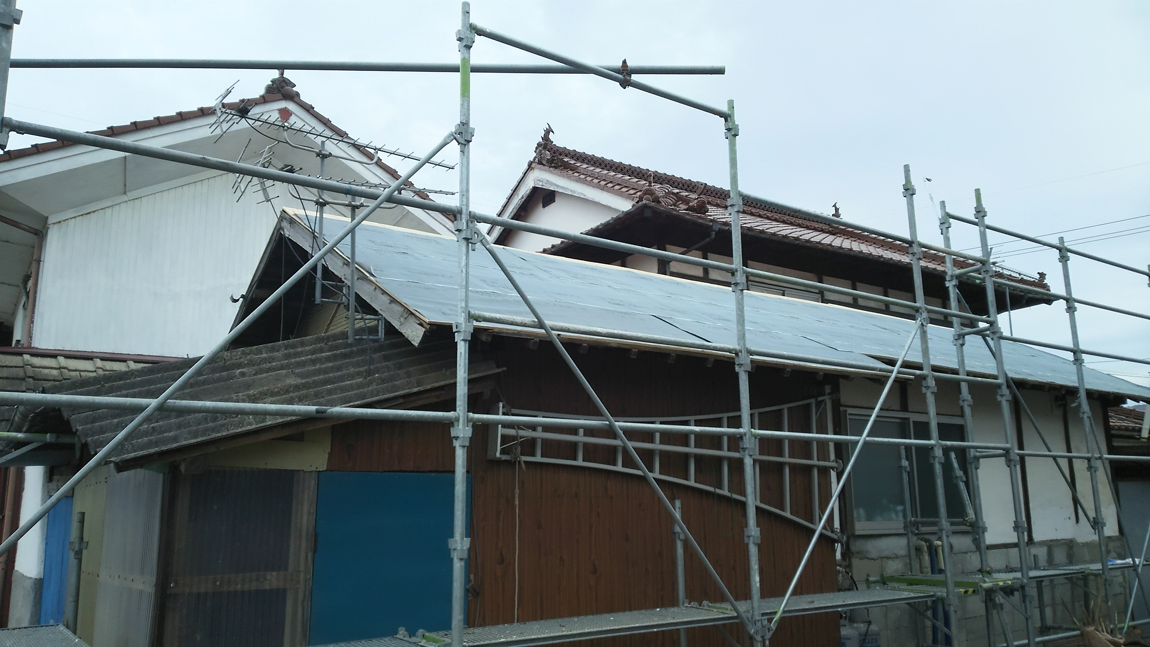板金屋根工事中です‼構造用合板を追い張りした後、ルーフィングを貼っていきます。