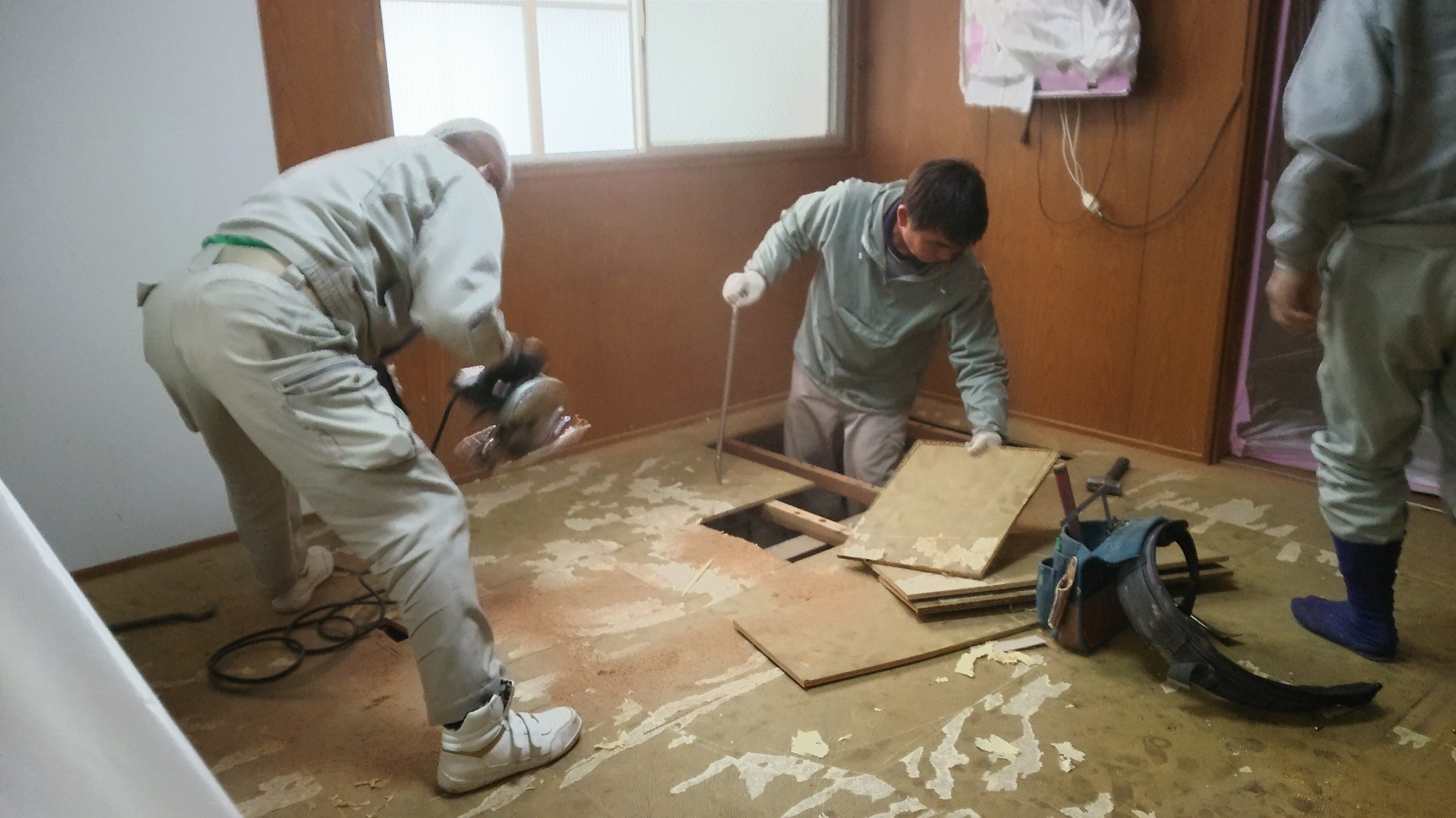 キッチンフローリング工事着工です。既存の床がフワフワしているので、まずは床の解体をしています‼