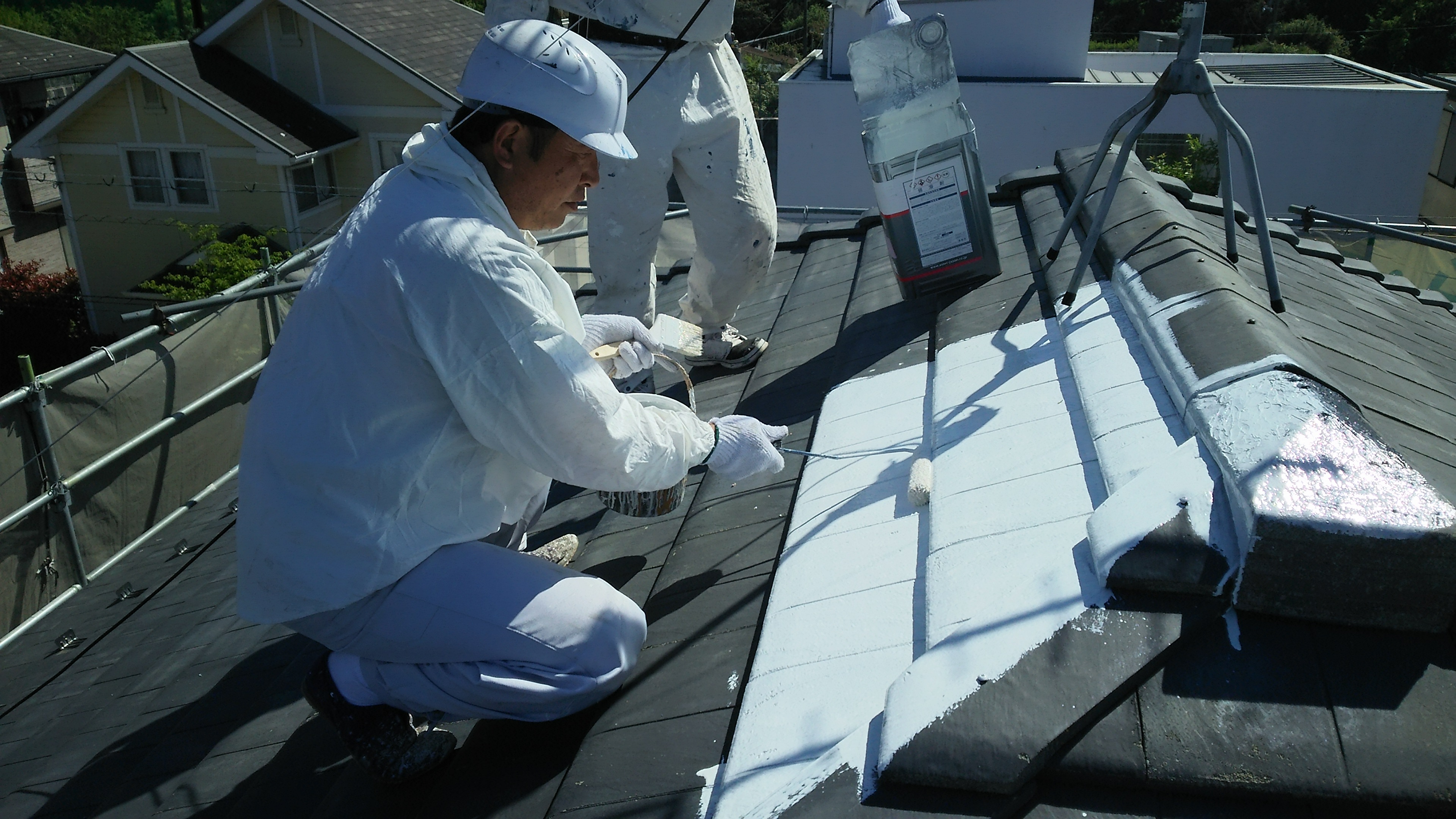 外壁・屋根塗装工事。今日は屋根の下塗りをしています‼
