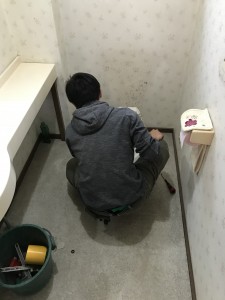 N様邸トイレ取替工事本日着工しました。今既存のトイレを取り外、しクッションフロアを張替えた後新しいトイレを取り付けていきます。