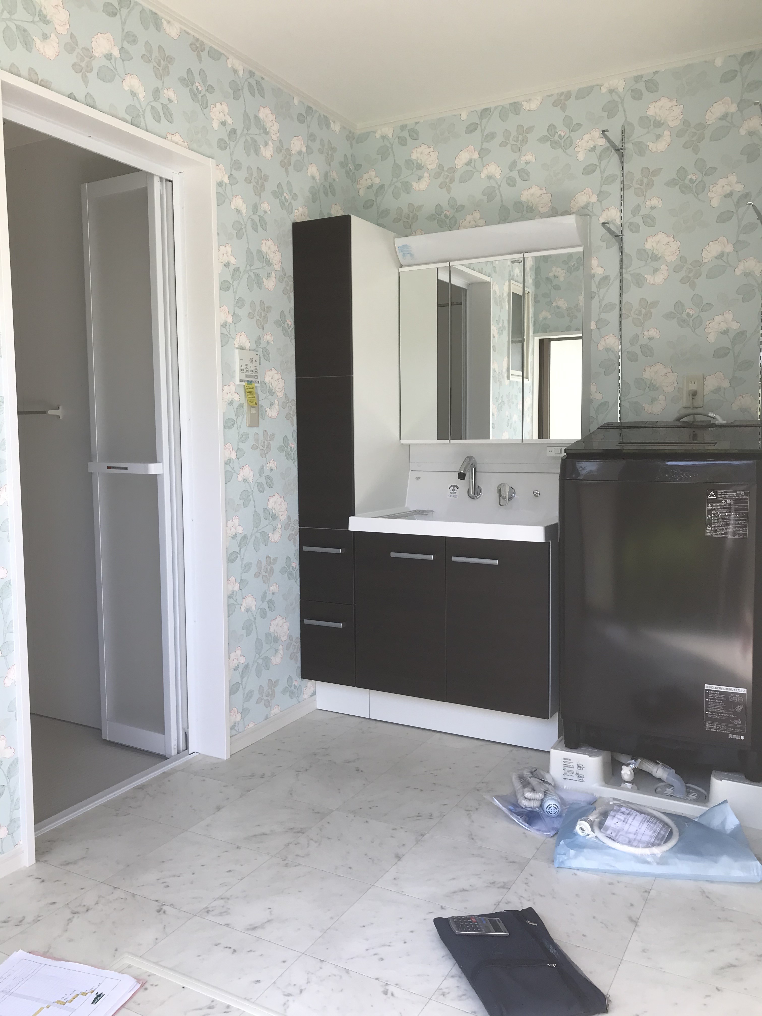 T様邸浴室洗面所工事進捗状況です!本日洗面所の器具づけでした。問題なく綺麗に取付完了しました。