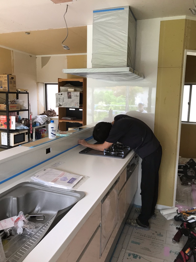 T様邸LDK工事進捗状況です!本日キッチンの組み立てを行い、無事綺麗に仕上がりました!