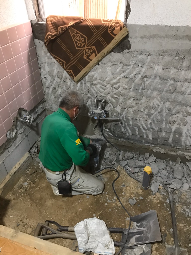 K様邸浴室洗面所工事進捗状況です!本日より着工、工程通り養生、解体完了いたしました!