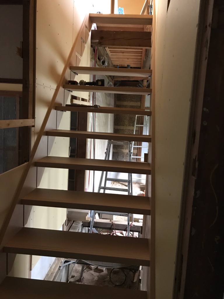 T様邸大規模改修工事進捗状況です!引き続き造作工事を行なっております。大工さんが安全作業のもと階段を造っていきます!