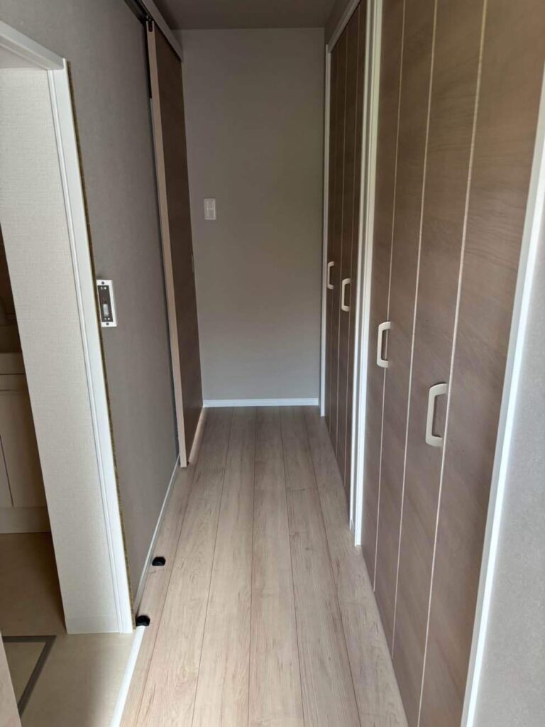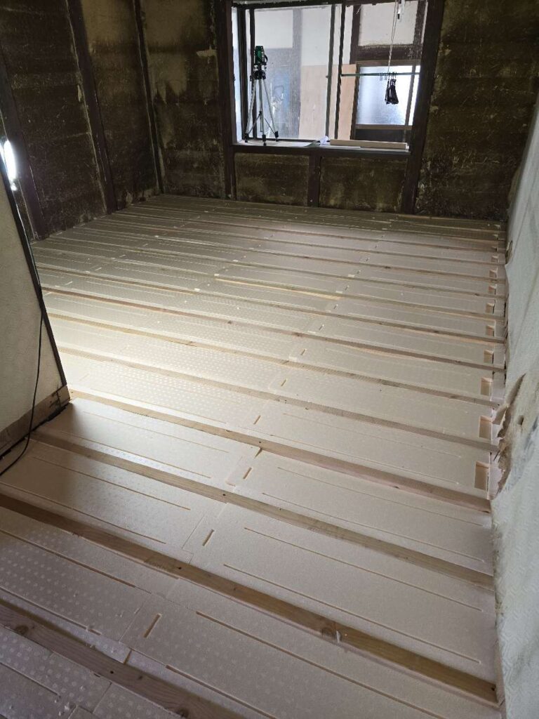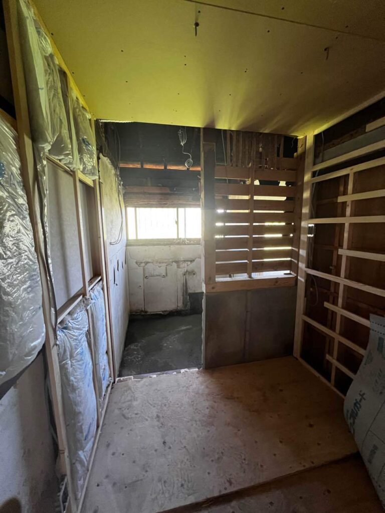 既存の床材・下地・壁材を撤去し、洋室仕様に合わせたフローリング下地と断熱材の施工を行いました。間仕切り壁を新設し、動線とプライバシーを考慮したレイアウトへ変更。電気配線の見直しやコンセント位置の最適化も同時に進め、快適性に配慮した室内環境を整えています。