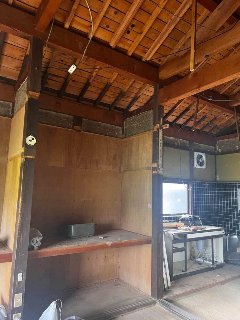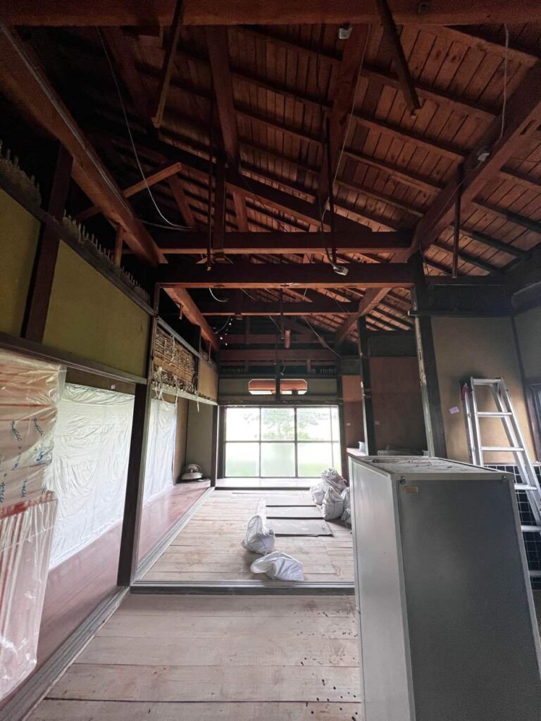 既存の壁や天井、襖、間仕切りをすべて撤去し、内部をスケルトン状態にしました。目に見えない梁や柱、土台の状態を確認でき、古民家特有の構造を把握することができます。今回間取り変更に必要な、「抜きたい柱」と「残すべき柱」の判断を行いました。抜きたい箇所には別の位置で梁や柱を追加して補強し、荷重を分散させます。開放的なLDKを実現しながらも構造安全性を確保しています。また、土壁の裏側や既存木部のシロアリ被害や腐食箇所を検査し、必要に応じて補修を行いました。古民家を活かしつつ、現代の耐久性と安全基準に合わせるための重要な工程です。