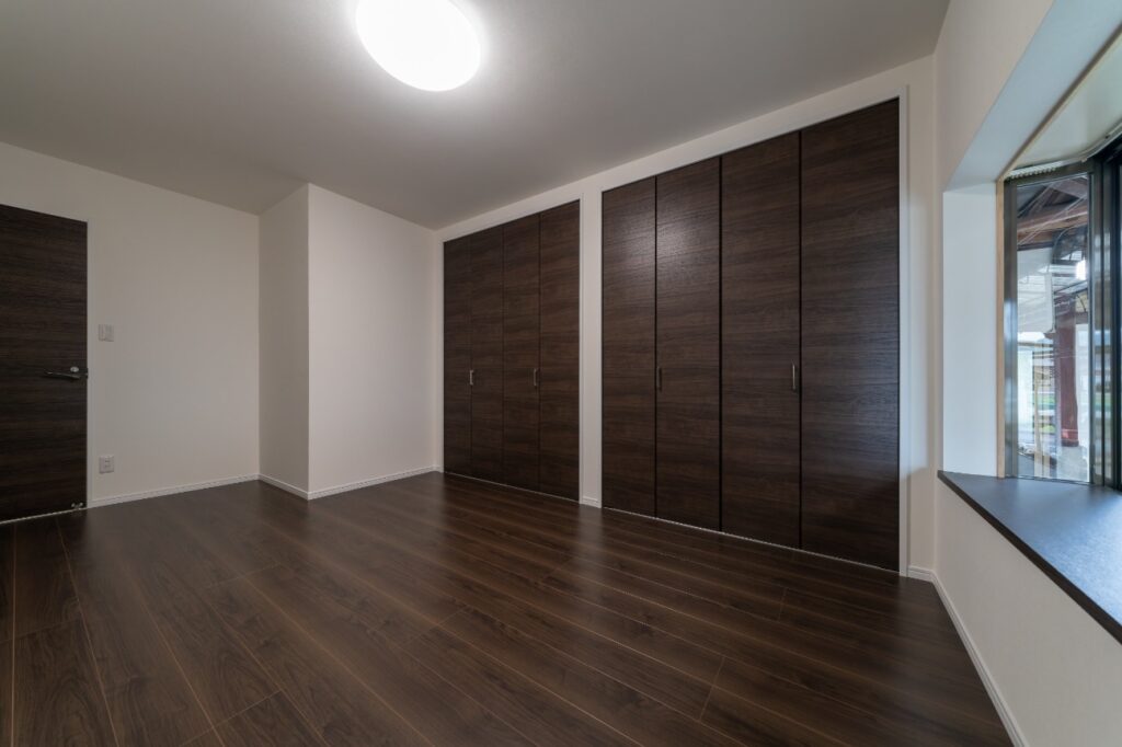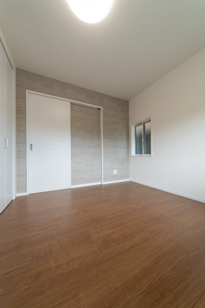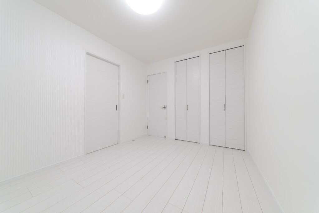 それぞれのお部屋は、ご家族一人ひとりの好みに合わせてフローリングや壁紙をセレクトしていただきました。こちらの洋室は、白を基調とした内装でまとめ、明るく清潔感のある印象に仕上げています。