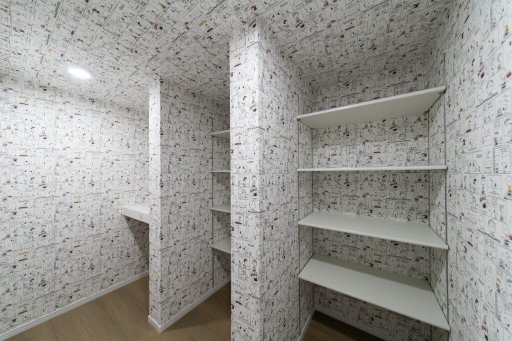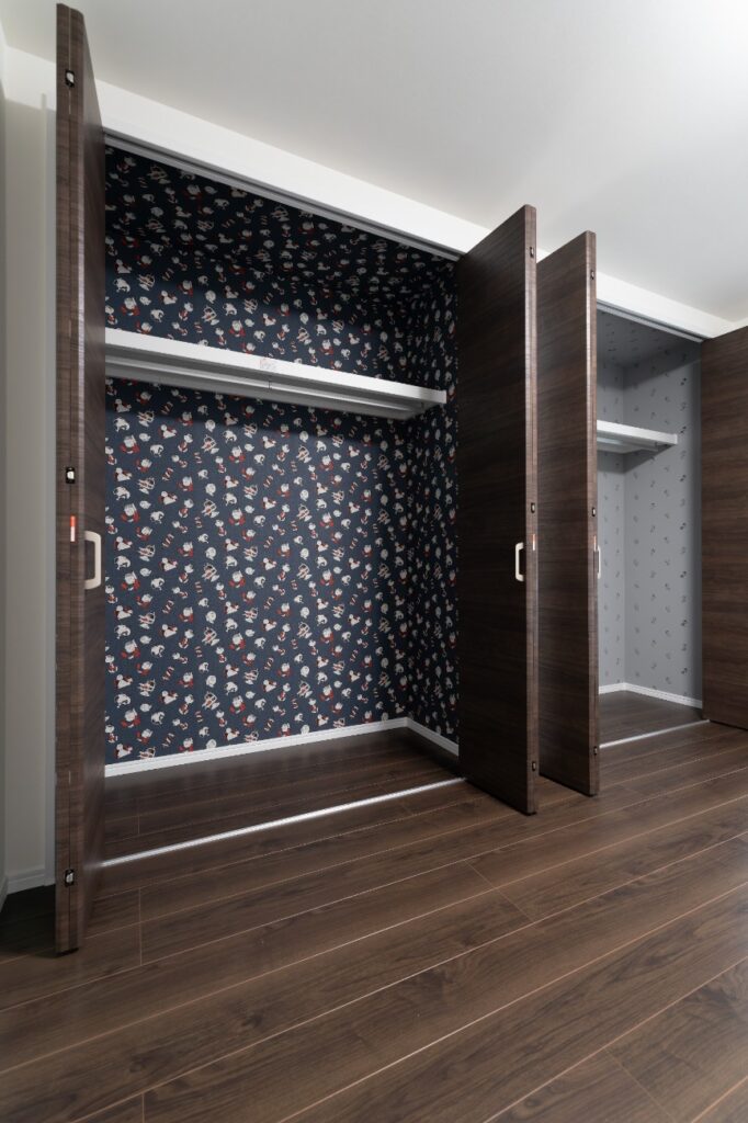 シンプルな室内と違い収納内部の壁紙には、お気に入りの色柄を取り入れました開けるたびに嬉しくなる仕上げです。