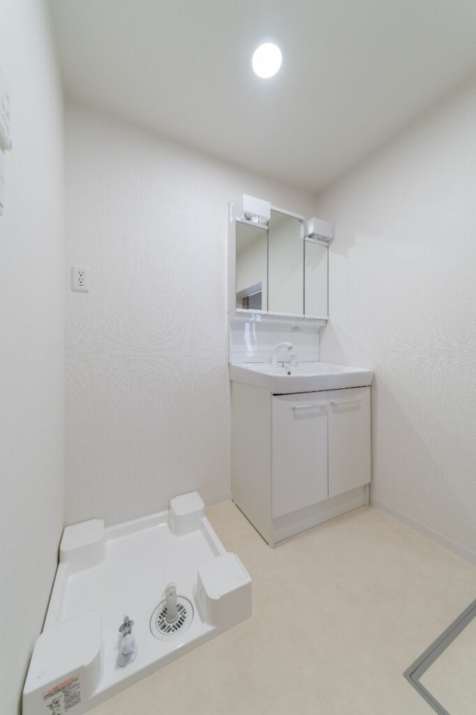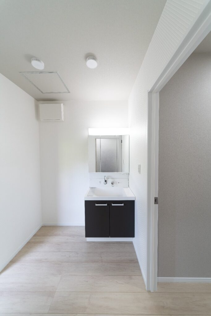 こちらは、娘さんご家族が使用される洗面室です。親世帯の洗面室とは別に設けることで、お互いが気兼ねなく使える動線と設備配置を計画しました。