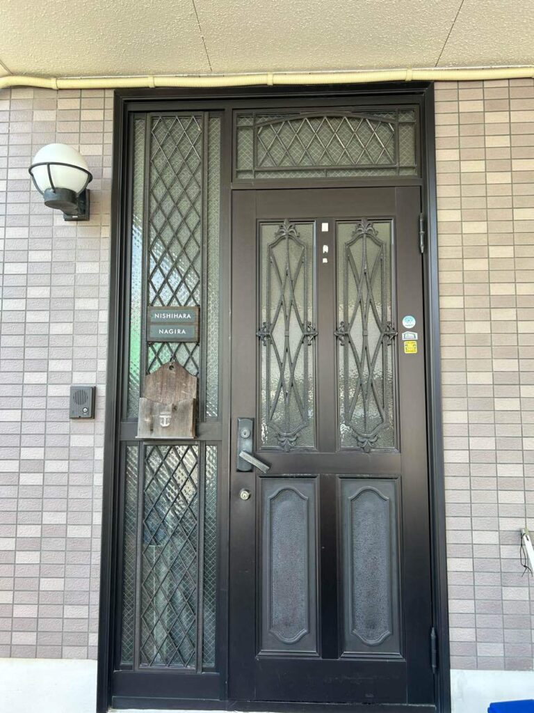 工事前は、玄関ドアに住居らしさが残っていました。 店舗としての入口として、落ち着いた印象へと仕上げていきます。