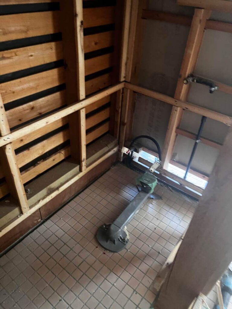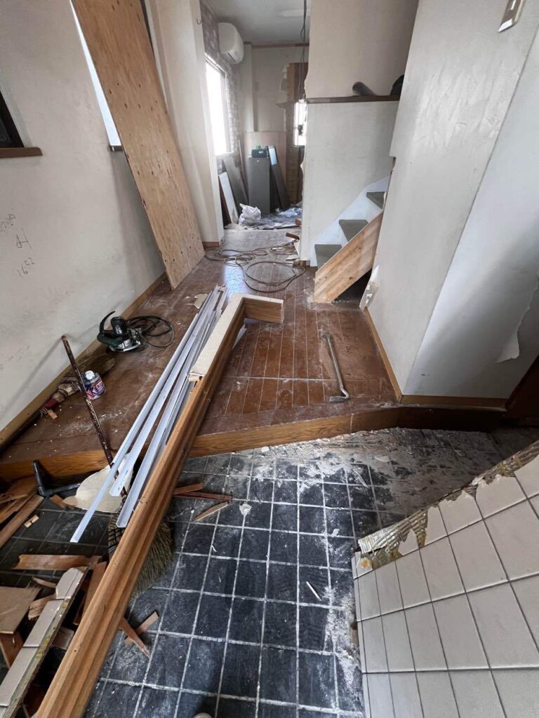玄関ホールの解体です。洗面・トイレへ繋がるように、 玄関収納が置かれていた壁を一部撤去します。 内装の仕上げが綺麗に行えるよう、下地を整えていきます。