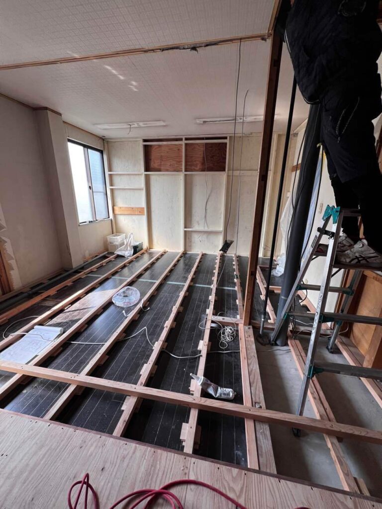 今回の建物は RC構造(鉄筋コンクリート造) のため、 上から無垢材を重ね張りする工法を採用しました。 また、床材の厚みによる 建具や段差の影響が出ないよう、 敷居や框まわり、扉のクリアランスも細かく調整を行い、 自然な納まりになるよう丁寧に施工しています。