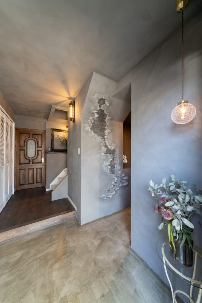 玄関ホールは、日常の気配からサロンの空気へと、やわらかく切り替わる場所として仕上げました。 グレーの漆喰が光を柔らかく受け、足を踏み入れた瞬間に、呼吸がひとつ深くなるような空間です。壁の一部には、下地のレンガをあえて見せるデザイン。こちらもN様が造られました!