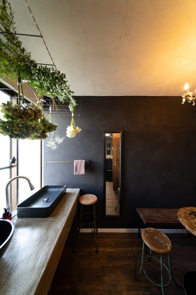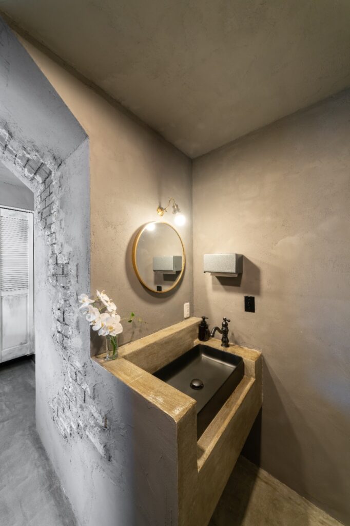手洗いスペースも、サロンの空気に合わせて仕上がりました。グレーの漆喰と柔らかい光が、心地よく印象に残る空間を演出してくれています。