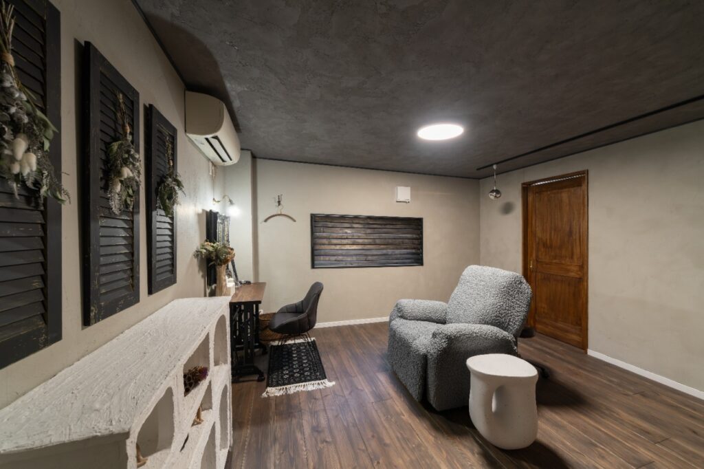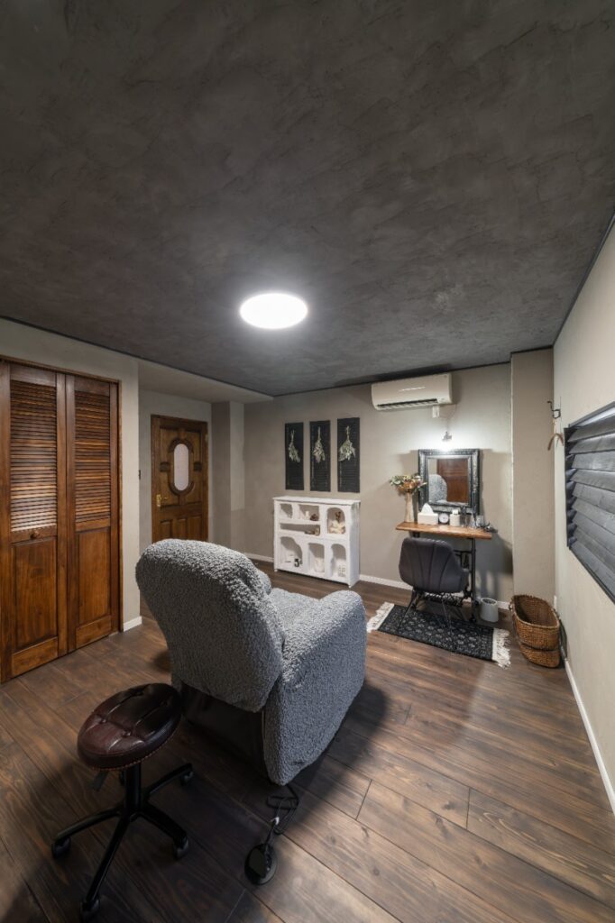 N様は、もともとご家族の事務所の休憩スペースとして使われていた1階の一室を、 ご子息ご夫婦が開業される ヘッドスパサロンへと改装したい とのご相談で来店されました。 「訪れた人が、日常から少し離れて落ち着ける異空間のようなサロンにしたい」 という明確なイメージをお持ちで、 内装の世界観・照明位置・家具の雰囲気までしっかりと検討されていました。 また、N様ご自身が 壁や天井の漆喰仕上げ・床や建具の塗装 など、 仕上げの工程に ご自身の手で関わりたい というご希望がありました。 自然素材の質感や手触りを大切にしながら、 「自分たちの手で育てていくサロン空間」 を目指されていました。