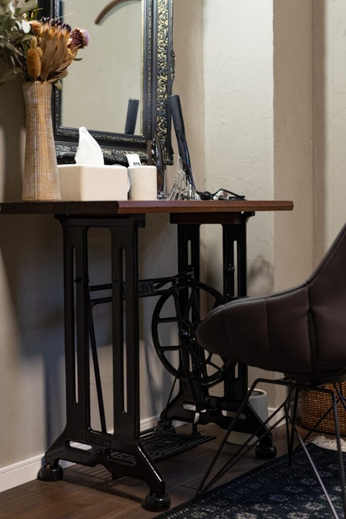 ミシン台は、もともとスタッフの私物でしたが、サロンの雰囲気に合うと感じ、お譲りさせていただきました。N様がカウンターを取り付けてリメイクしてくださり、空間に溶け込む サロンの一部として新たに息づいています。