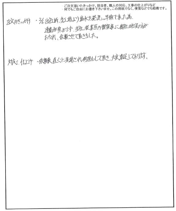 注文のきっかけ:2/6出社時、当工場より漏水を発見。早朝であった為連絡が繋がらず 当社従業員の御家族に御社の社員の方がおられ、依頼させて頂きました。 対応・仕上げ:依頼後直ぐに来場され修理して頂き、大変満足しております。