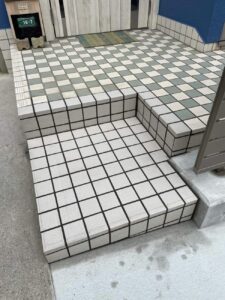 駐車場拡大に伴い、玄関ポーチの階段まで削った代わりに、玄関ポーチの一部に階段を作りました。 床タイル:ニュージーネット 100角 No.1