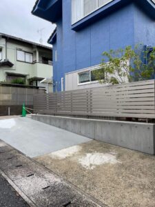 駐車場を車一台分広げて、元々目隠しブロックがあった場所に目隠しフェンスを採用されました。 目隠しフェンス:三協アルミ レジリア 横格子 YK3型 アーバングレー